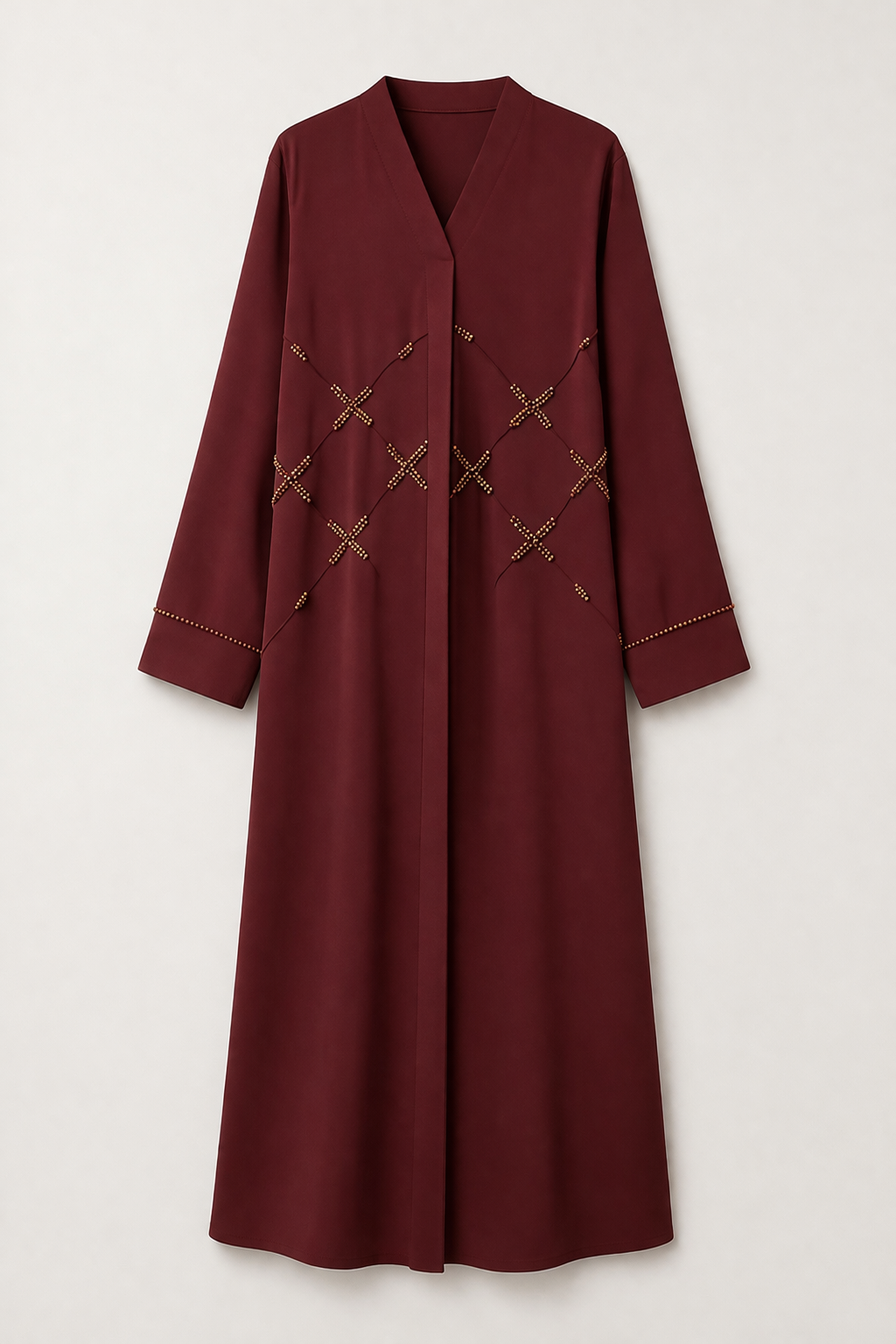 Cette abaya bordeaux élégante allie sobriété et raffinement avec sa coupe fluide et son tombé léger. Son design est sublimé par de délicates broderies perlées dorées formant des motifs géométriques sur le devant et les manches, apportant une touche chic et discrète. Son col en V et ses manches larges offrent un style moderne tout en restant modeste et confortable. Idéale pour les occasions, les sorties ou le quotidien, cette abaya se porte facilement avec des accessoires sobres pour un look élégant et intemporel.